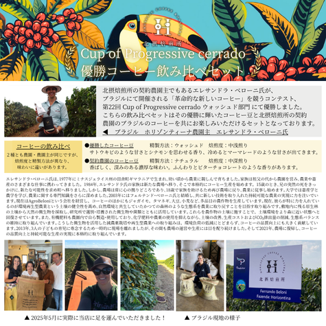 北摂焙煎所の契約農園主であるエレサンドラ・ベローニ氏が、 ブラジルにて開催される「革命的な新しいコーヒー」を競うコンテスト、 第22回 Cup of Progressive cerrado ウォッシュド部門 にて優勝しました。 こちらの飲み比べセットは見事優勝に輝いたコーヒー豆と当店自慢のブラジルのコーヒーを共にお楽しみいただけるセットとなっております。 ・セット内容 ブラジル優勝カップ100g(中浅煎り) & ブラジル100g(中深煎り)
